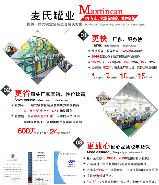 此款鹿角膠馬口鐵盒所采用的材質、油墨、配件等產品均為綠色環保材料,,產品曾多次通過機構認證檢測,其中包括:FDA、SGS、LFGB等,鐵盒從生產到出庫,全程無塵車間制作,QC全檢,保證每一款鐵盒都標準、安全。真正打造國內鐵盒包裝品牌。