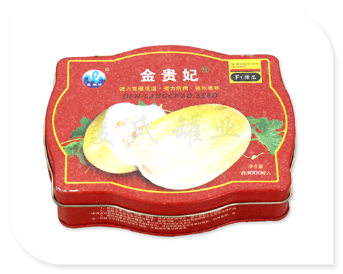 這款哈密瓜種子金屬盒,外卷線蓋身鑼底+內扣箔,開天窗結構,波浪形外形設計。,其鐵盒的密封性能良好,能有效的防止水分空氣盒內,防止種子發芽生長;硬度強、剛性好,可以保護盒內的種子不受外力的擠壓而使種子產品受到損壞。